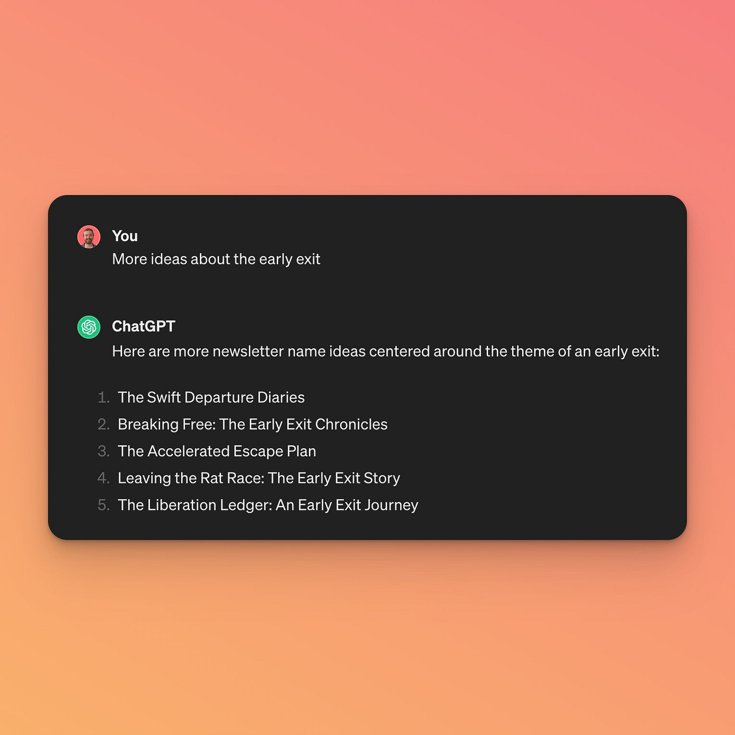 I had the idea at the gym one day and spent some time with ChatGPT to brainstorm ideas for a newsletter about transparently sharing your income as you worked towards a major goal. While ChatGPT didn’t ultimately come up with the name Early Exit Club, it gave me the words ‘early exit’. Here’s part of the transcript: